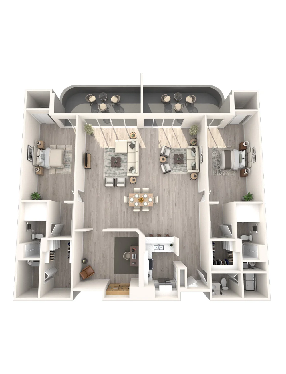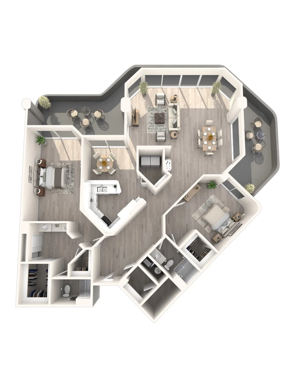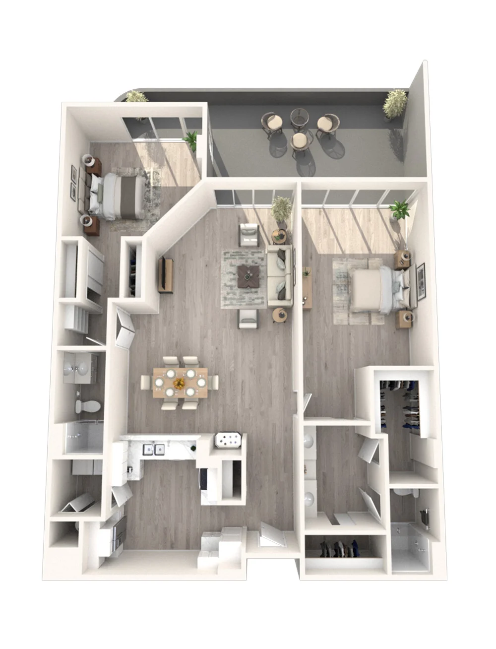 The Admiral floor plan artfully combines form and function within 1,770 square feet. The open living space connects to two bedrooms and an expansive balcony.