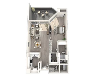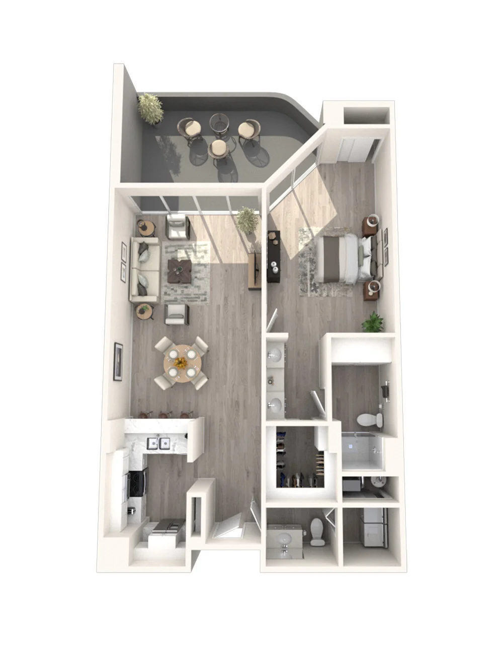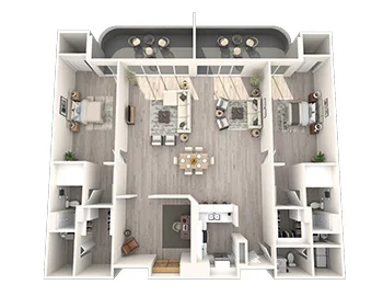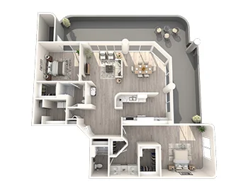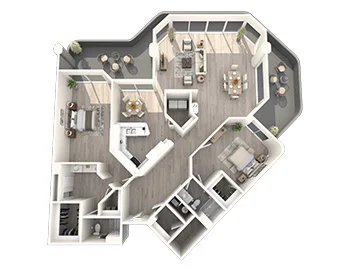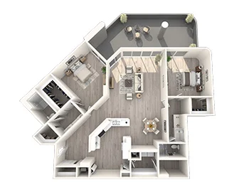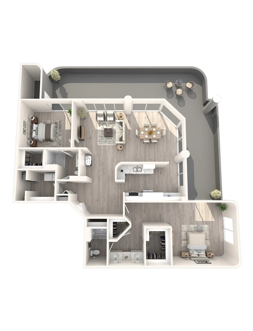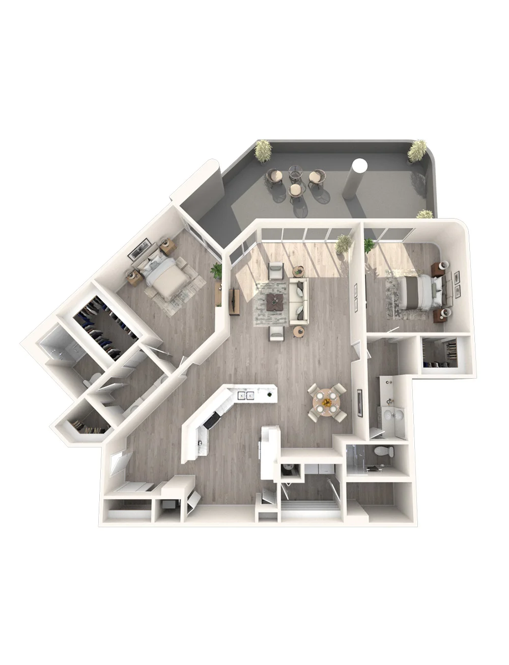 The Admiral floor plan artfully combines form and function within 1,770 square feet. The open living space connects to two bedrooms and an expansive balcony.