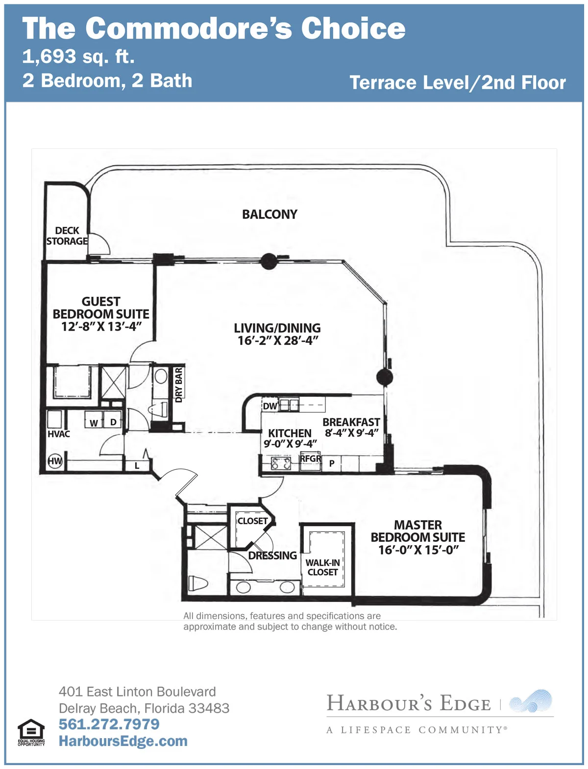 The Commodore’s Choice 1,693-square-foot floor plan flows seamlessly from the central kitchen to the living space and out onto the balcony. Both bedrooms have walk-in closets and private baths.