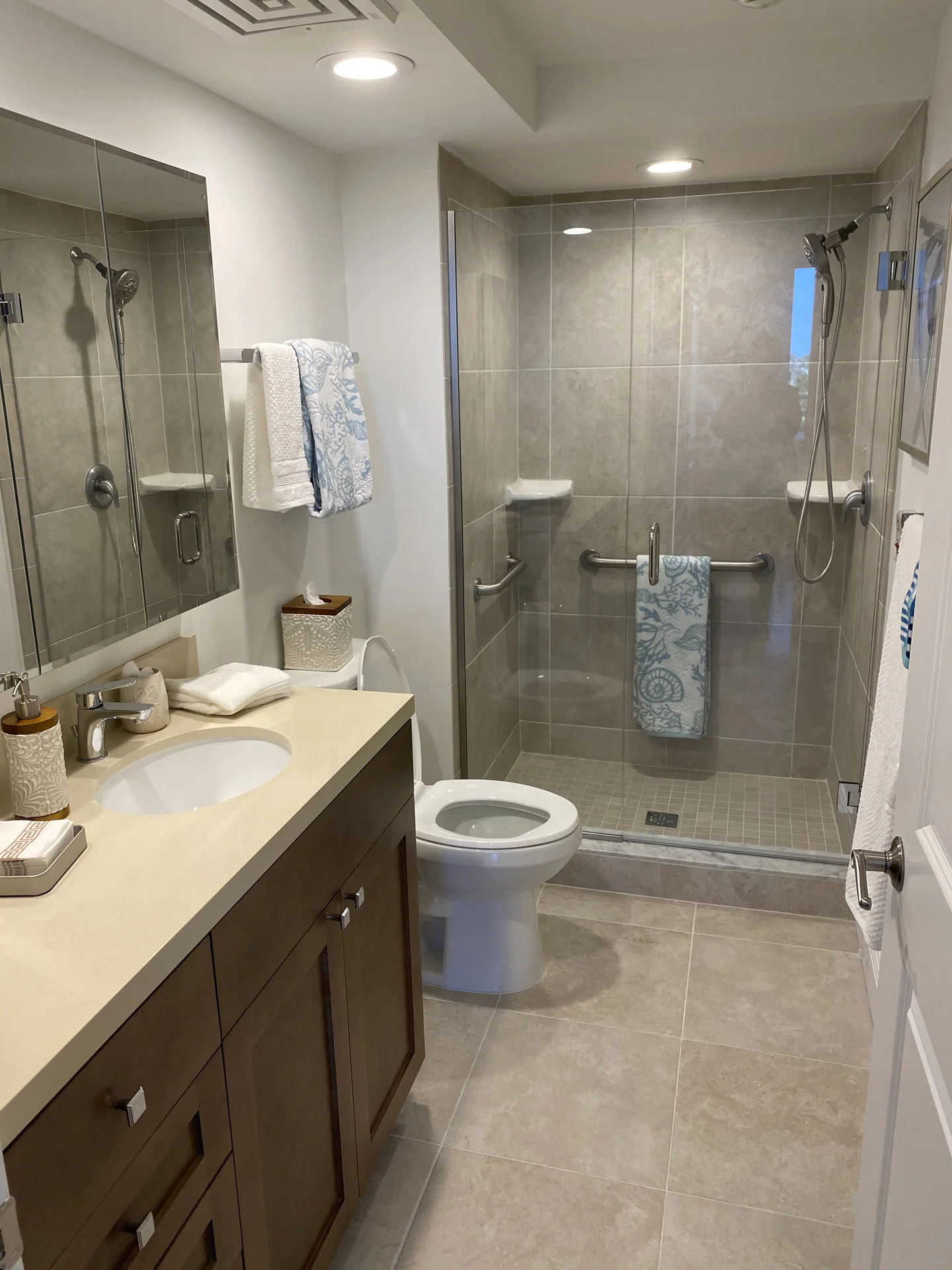 The Windjammer is a luxurious retreat with a full kitchen and open living space that looks out onto a generous balcony. The primary bedroom boasts an ensuite bathroom with dual sinks and ample closet space. The guest suite includes a pass-through closet that offers easy access to an additional half-bath.