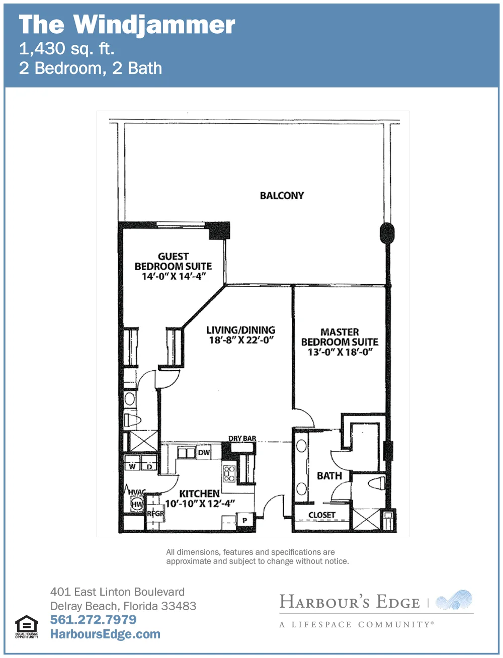 Make the Windjammer’s 2-bedroom, 2-bath plan your own personal retreat. With 1,580-square-feet of space, the Windjammer features two roomy en-suite bedrooms, an open living and dining area, and a spacious balcony.