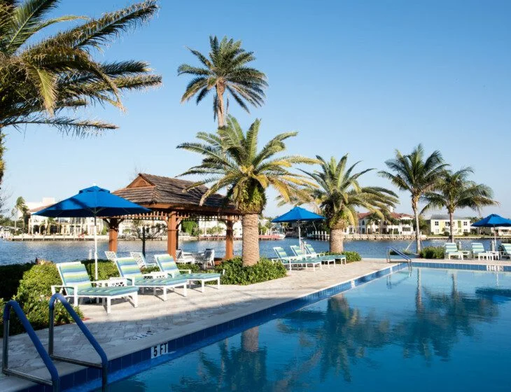 - A temperature-controlled swimming pool, whirlpool spa and adjacent pool deck lounge next to the water.